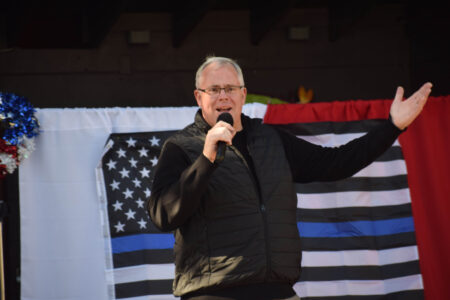 State Senate candidate Dan Stec speaks at a Saranac Lake Republican rally in Riverside Park on Oct. 23. (Enterprise photo — Aaron Marbone)