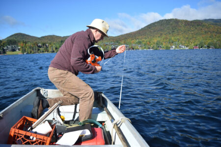 On his last sampling foray this September, Wilson lowered the disk into the lake by a measuring tape attached to its center. As soon as the disk disappeared out of his sight, he measured how far the disk was from the water’s surface. Then, he raised the disk and measured the distance to the point at which it reappeared. The Secchi measurement is the average of those two numbers. Usually — and in perfect conditions, according to Wilson — Lake Placid’s Secchi measurement is somewhere between eight and nine meters. Wilson said that’s been dropping to between six and seven meters in recent years as the water’s clarity decreases. On Sept. 24, the final measurement was 6.7 meters.