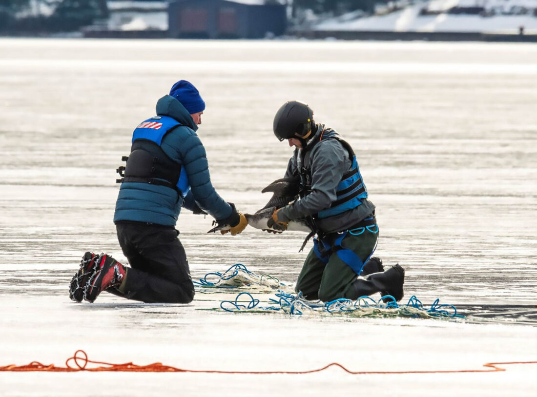 Eventually, ACLC staff and volunteers captured the loon, a juvenile they found in good health. Denny said this was the loon’s first winter. It hadn’t had experience migrating before. Schoch said it’s more common for young loons to get iced in at this time of year.