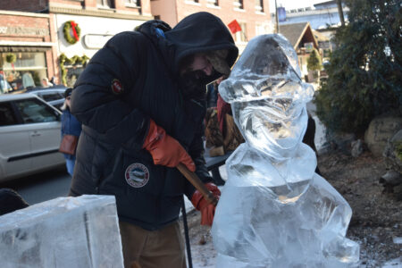 - Ryan Hill, of Akwesasne, carves the Grinch out of a block of ice outside Adirondack Decorative Arts & Crafts during the Holiday Village Stroll in Lake Placid on Saturday. (Enterprise photo — Lauren Yates)