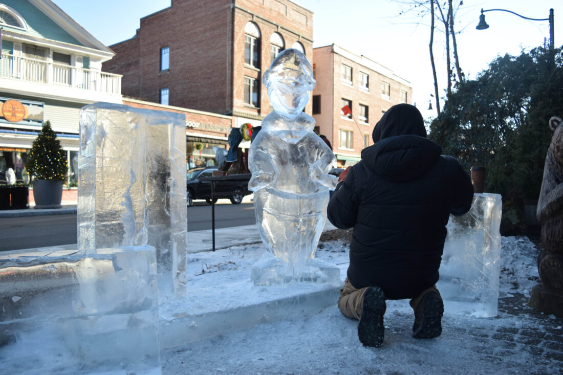 People stopped to snap photos and ask him questions about the carving as he chiseled the finishing touches into his Grinch in the early afternoon. Hill was given four ice blocks to carve at the Holiday Village Stroll, and he said he hoped to finish carving the remaining three blocks by the end of the day.