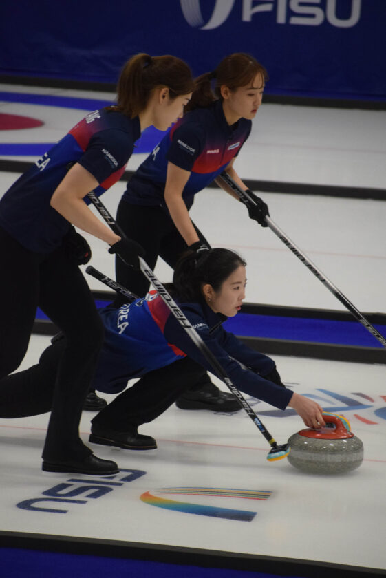 - Korean curlers, from front Taei Yang, Seung-youn Ha and Sujin Kim send a stone down the ice in the gold medal match against China on Saturday. China won in a tight competition 6-4.(Enterprise photo — Aaron Marbone)