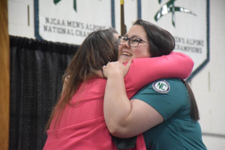 Marllie Tanzini, right, hugs adjunct nursing faculty member Stephanie Cassell at a nurse pinning ceremony at North Country Community College on Thursday.
