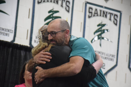 - Dustin Ulrich hugs nursing faculty member Lauren Heath at a nurse pinning ceremony at North Country Community College on Thursday. (Enterprise photo — Aaron Marbone)