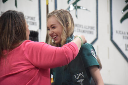 Hannah Pecor hugs adjunct nursing faculty member Stephanie Cassell at a nurse pinning ceremony at North Country Community College on Thursday.