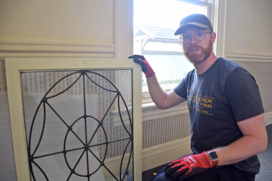 Erik Genalo from Richardson Window Works out of Cooperstown holds an antique window in the former home and office of Edward Livingston Trudeau on Tuesday. Historic Saranac Lake is restoring this building to its historic look as it converts the structure into a second museum space. (Enterprise photo — Aaron Marbone)