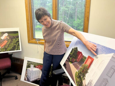 - The APA’s executive director Barbara Rice shows plans for the proposed new headquarters in Saranac Lake. (Provided photo — Emily Russell/NCPR)