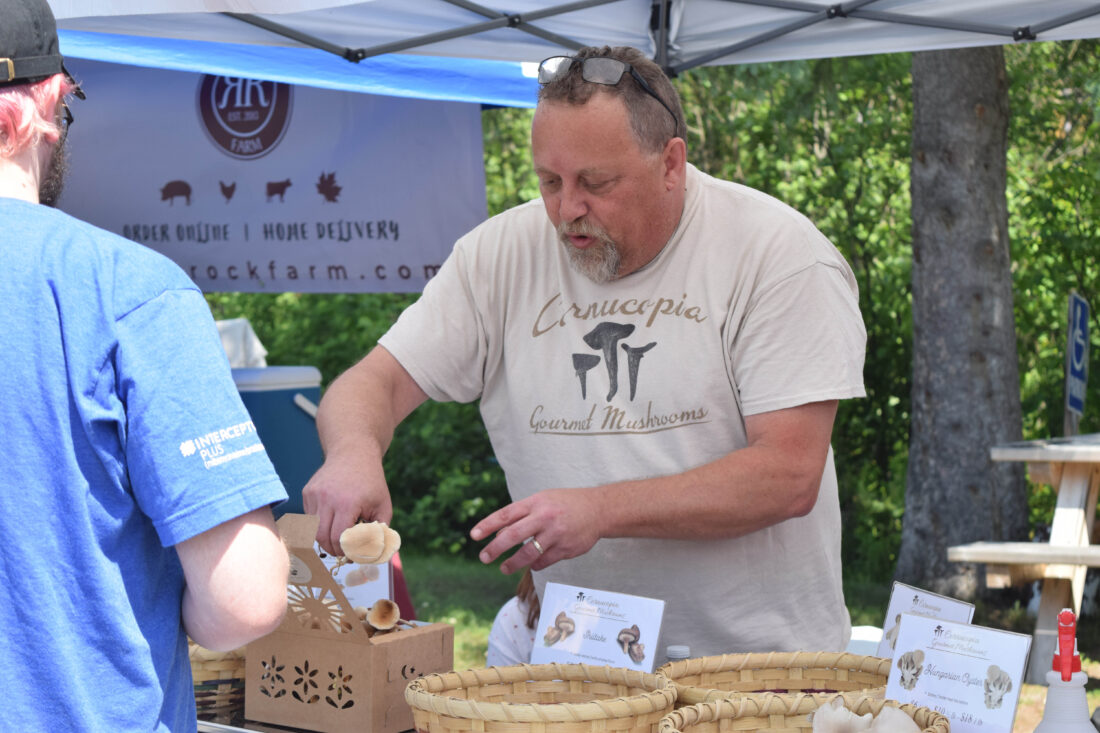 Greg Rowe, the owner of Keeseville-based Cornucopia Gourmet Mushrooms, packages some of his lab-grown mushrooms for a customer at the High Peaks Farmers Market in Lake Placid. Rowe is growing his mushrooms out of the former Keeseville High School, a 1930s-era building where he nurtures a humid environment for mushroom varieties like Lion’s Mane, Shiitake and Hungarian Oyster. Rowe is a vendor at the Lake Placid market — which runs from 9 a.m. to 1 p.m. on Wednesdays in the Green Goddess parking lot — and Keene Valley farmers market, which runs from 9:30 a.m. to 2 p.m. every Sunday at Marcy Field. The Lake Placid farmers market opened for the season on June 14 and runs through Sept. 13. (Enterprise photo — Lauren Yates)