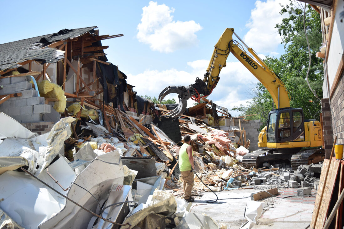 Construction crews with Pratt Excavating begin demolition of the former Desperados Restaurant on Saranac Avenue in Lake Placid Wednesday. The leveled restaurant will be the site of a new Stewart’s Shops convenience store and district office. The existing convenience store will remain open during construction and will be demolished once the new shop is open. Construction crews said on Wednesday that they expected to complete demolition on Wednesday and haul the rubble away from the site on Thursday. Once construction of the new shop starts, crews said, it could be completed within 90 days. (Enterprise photo — Lauren Yates)