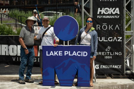 From left, Jose R. Maldonado, his son and racer Jose A. Maldonado and Jose A.’s wife Tina Maldonado pose for a picture Friday in the Ironman Village at the Olympic Speedskating Oval in Lake Placid. (Enterprise photo — Arthur Maiorella)
