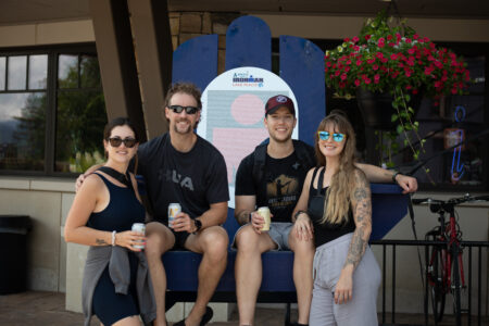 - From left, Aaron Battistoni, Dilyn Gilbert, Jon Wright and Chanelle Guay relax Friday in front of the Olympic Center in Lake Placid. Gilbert and Wright are competing in Sunday’s Ironman triathlon. (Enterprise photo — Arthur Maiorella)