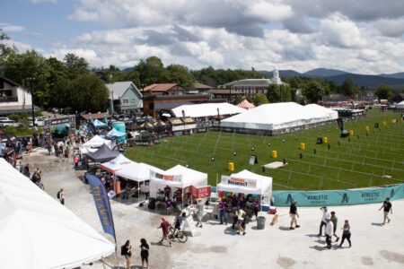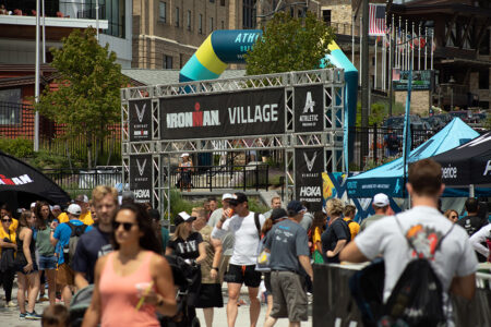 Spectators, athletes and rubberneckers mill around the Ironman Village Friday at the Olympic Speedskating Oval in Lake Placid. While the area is currently home to vendors and tents, on Sunday it will be where athletes transition from the Ironman’s 2.4-mile swim portion to its 112-mile bike, then to its 26.2-mile run, and then cross the finish line.