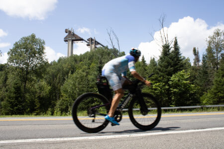 An athlete rides by the Olympic Jumping Complex on state Route 73 Friday, preparing for Sunday’s Ironman Lake Placid triathlon.