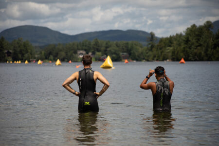 - Steven Duguay, left, and Timur Coufure wade into Mirror Lake before a training swim on Friday. On Sunday this will be the starting site of the Ironman triathlon. (Enterprise photo — Arthur Maiorella)