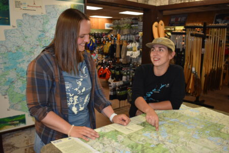 Maeghan Farnham, left, speaks with St. Regis Canoe Outfitters Manager and Guide Amelia Dragone inside the Dorsey Street store on July 13. (Enterprise photo — Elizabeth Izzo)