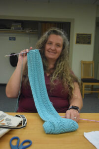 - Laura Reid said she enjoys knitting alongside her friends in the “Knitterondackers” social knitting group, and finds inspiration from their ideas. The group meets every week from 1:30 to 4:30 p.m. in the basement of the Saranac Lake Free Library. Their work will be featured in a fiber arts show at the library from Oct. 2 to Nov. 25. (Enterprise photo — Aaron Marbone)