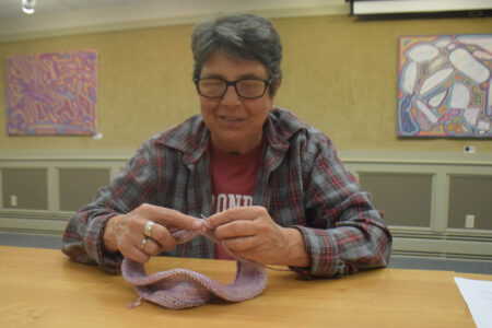 - Christa Gordon works on a scarf while talking with the “Knitterondackers” social knitting group on Thursday. (Enterprise photo — Aaron Marbone)