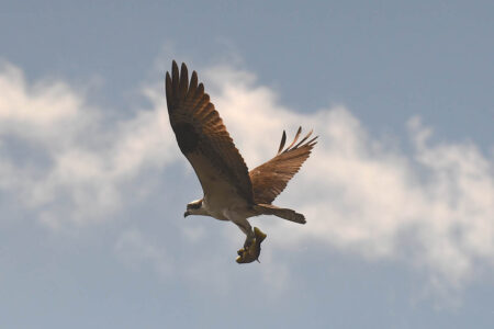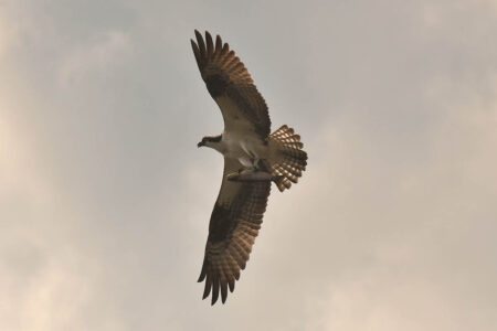 - An osprey flies away with a trout that it plucked from the waters of Lake Colby in Saranac Lake Monday afternoon. (Provided photo — Lou Reuter)