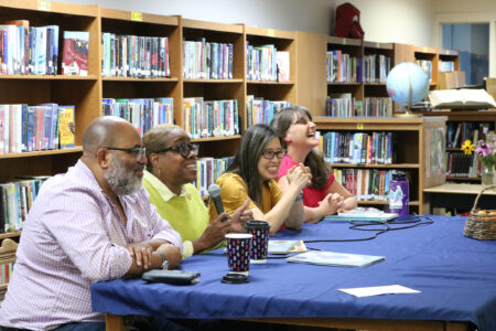 From left to right, authors James Ransome, Lesa Cline-Ransome, Grace Lin and Kate Messner take audience questions during their panel on collaborative picture books. (Enterprise photo — Sydney Emerson)