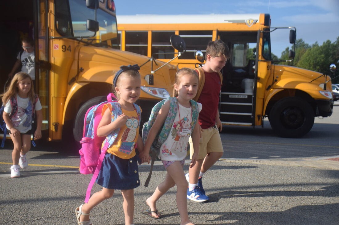 Emery Dewyea and Lauren Counter hold hands as they get off the bus and head in to L.P. Quinn Elementary School in Tupper Lake on the first day of school Thursday. (Enterprise photo — Aaron Marbone)
