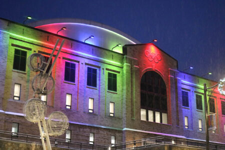 - The Olympic Center in Lake Placid was illuminated in the colors of the USA Luge logo on Thursday to honor the life of Dmitry Feld. (Enterprise photo — Sydney Emerson)