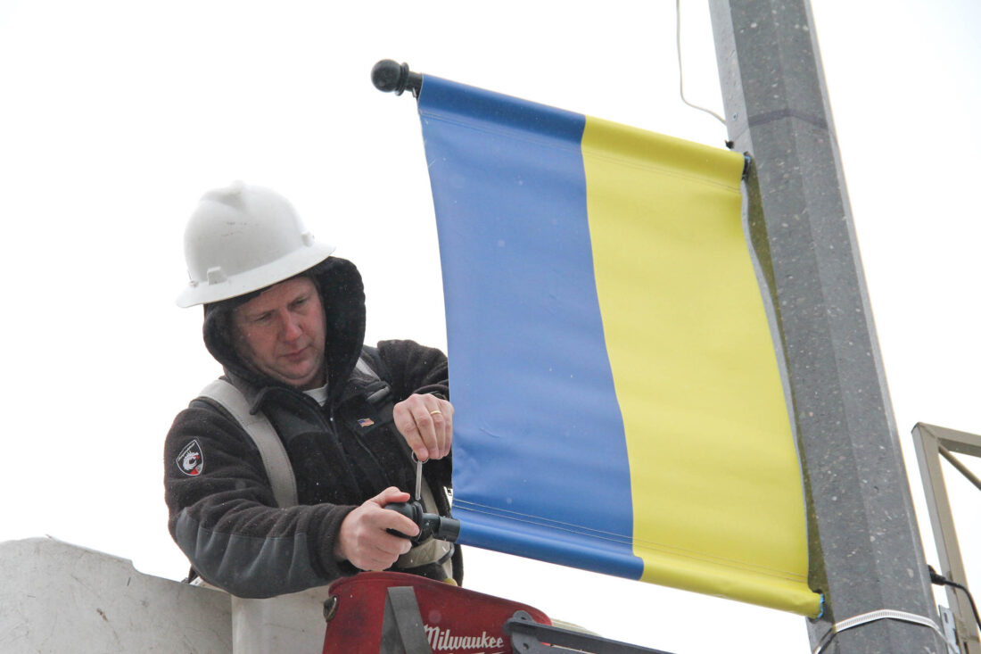 On Thursday morning, three crews from the Lake Placid Municipal Electric Department were out on Main Street in their bucket trucks, re-hanging the 20 Ukrainian flags that were first displayed in March 2022 at Feld’s suggestion to show support for Ukraine in the first months of its war with Russia.