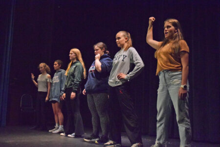 Lake Placid Central School theater students perform a number from the musical “Six” during a rehearsal on Wednesday. (Enterprise photo — Grace McIntyre)