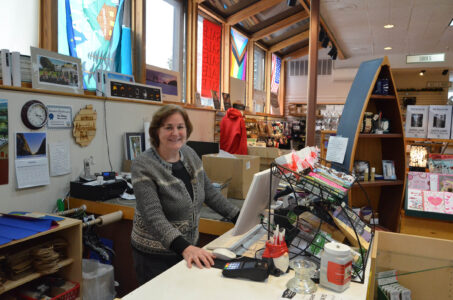 Historic Saranac Lake Program Coordinator Alex Krach hangs cobwebs in the museum’s laboratory on Wednesday, ahead of today’s “Historic Scare-anac Lake” event, which will fill the museum with ghostly games, haunted history and creepy crafts from 3 to 5 p.m. The thumb tacks Krach held in his mouth fittingly happen to also look like vampire fangs. (Enterprise photo — Aaron Marbone)