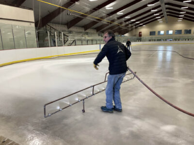 After it is mixed, the solution is applied to the rink using a metal tubing system meant to ensure an even and consistent coating. At that point, Welsh said the surface wasn’t yet slippery and personnel could paint the lines and logo. After the paint is applied and set, the surface is flooded and frozen.