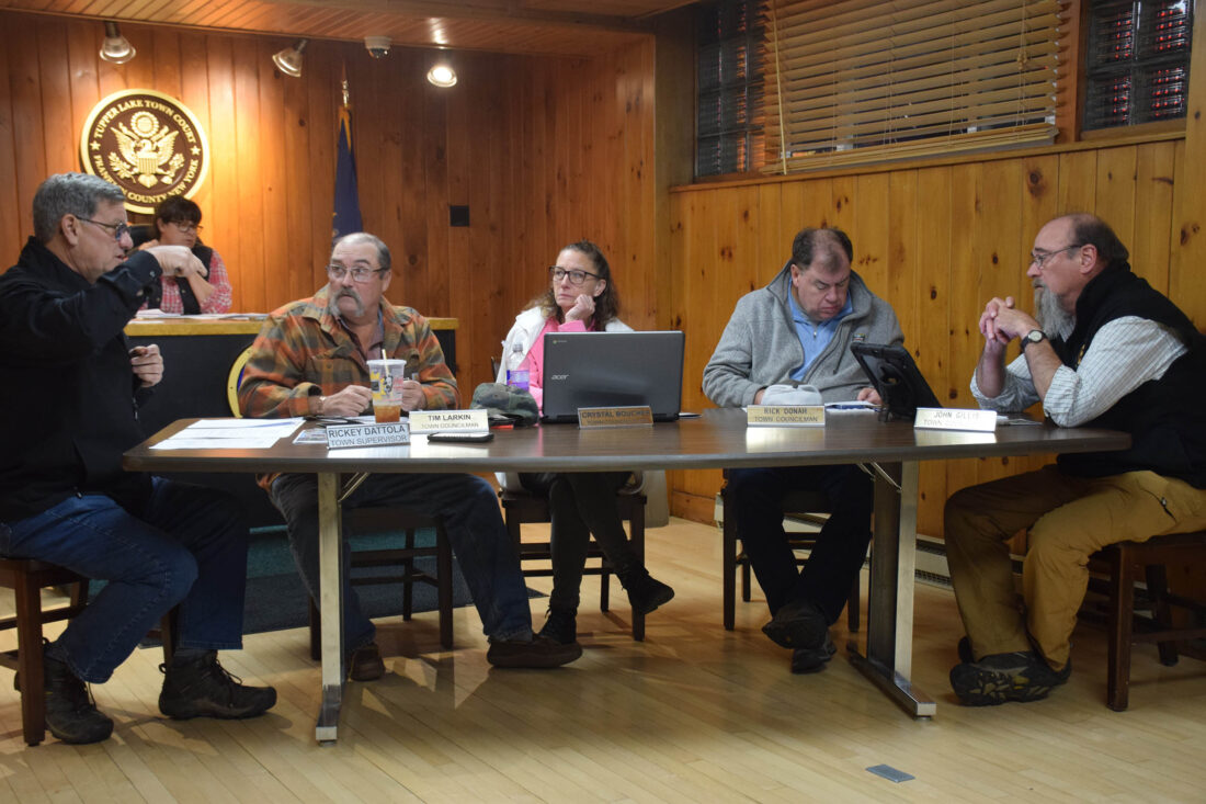 - Tupper Lake Town Supervisor Rickey Dattola, left, speaks at the town board meeting Tuesday evening. Dattola said the board was proud of the town recreation department and its employees after Director Laura LaBarge presented an annual update at the meeting. Also pictured, from left, are town Clerk Mary Kay Strack, Councilman Timmy Larkin, Councilwoman Crystal Boucher, Councilman Rick Donah and Councilman John Gillis. (Enterprise photo — Chris Gaige)