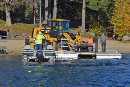 Crew members with the Lake Placid village Highway Department work to disassemble the swim dock at the Lake Placid Public Beach on Mirror Lake on Tuesday morning, an annual reminder that winter is on the doorstep. The water was 53 degrees Fahrenheit as of press time Tuesday evening, according to data from the Ausable Freshwater Center.