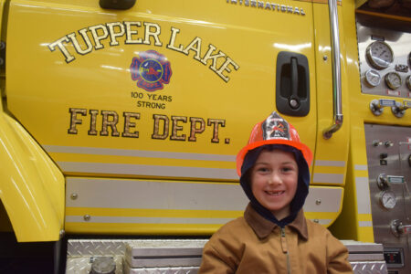 - Second-grader Theo smiles next to a Tupper Lake Volunteer Fire Department truck at the Tupper Lake Emergency Services Building on Wednesday evening during the Heroes and Helpers Night. (Enterprise photo — Chris Gaige)