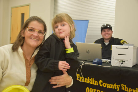 - Nina, left, and Zoey Hair smile in front of the Franklin County Sheriff’s Department Operation SAFE CHILD table staffed by county Correction Officer Tyler Reome at the Heroes and Helpers Night held at the Tupper Lake Emergency Services Building on Wednesday evening. The statewide operation raises awareness about child safety. Kids can have an ID card with the child’s name, biographical information, fingerprint images of both index fingers and a high-resolution digital photo — all of which are meant to help law enforcement work quickly if a child goes missing. Nina Hair is the president of the newly-formed Tupper Lake Central School District Parent Teacher Organization, which put on the event. (Enterprise photo — Chris Gaige)