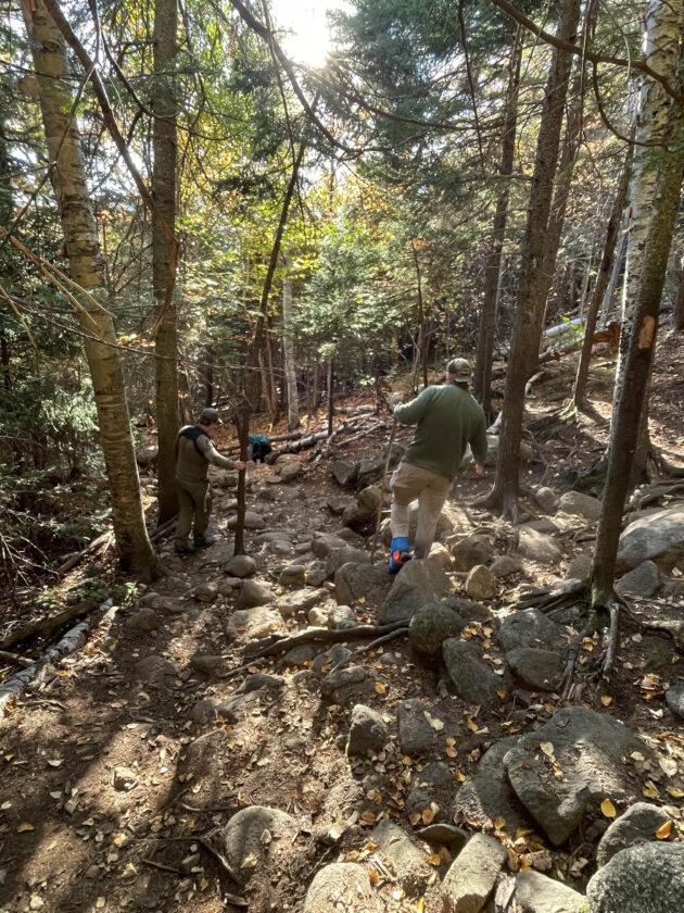 An injured hiker, right, makes their way down the Cascade Mountain trail in the town of Keene on Wednesday, Oct. 1. After the initial injury and leg splint, the hiker tripped on a rock and had to be flown out via helicopter. (Provided photo — New York state Department of Environmental Conservation)