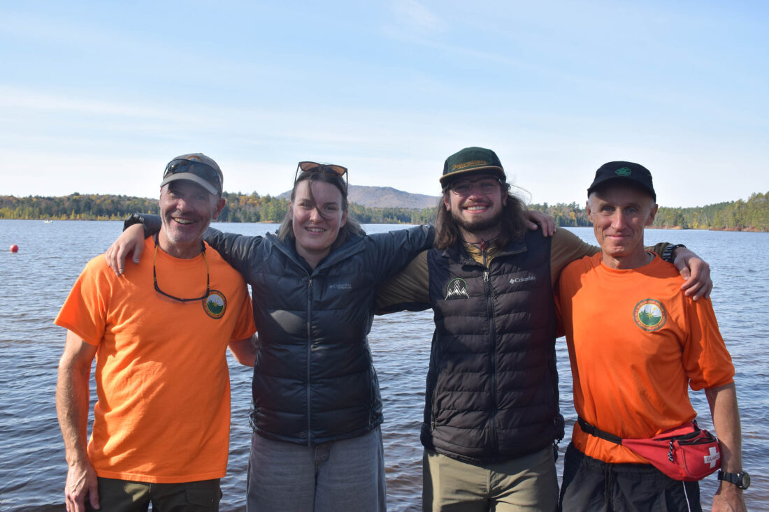 - Roundin’ Regis Regatta race and safety officials smile at the start/finish line, with Lower St. Regis Lake in the background on Sunday at Paul Smith’s College. From left, Jeff Berry, Grace Hiltunen, Bailie Charette and Doug Goodfellow. Berry and Goodfellow are with Search and Rescue of the Northern Adirondacks, whose volunteer members provide safety and emergency response services in backcountry settings. (Enterprise photo — Chris Gaige)