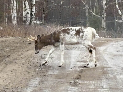 A piebald deer crosses a road in Saranac Lake on Saturday. Piebald deer are rare, making up around only 2% of the deer population. Folklore says shooting a piebald deer brings a curse on all future hunting. (Provided photo — Avery Hollrock)