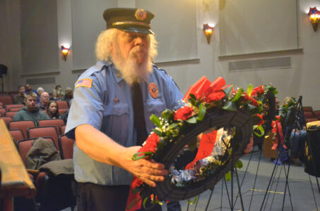 - Mike Russell lays a wreath for the Tupper Lake Volunteer Fire Department and the TLVFD Ladies Auxiliary at the town’s Veterans Day ceremony on Tuesday. (Enterprise photo — Aaron Marbone)