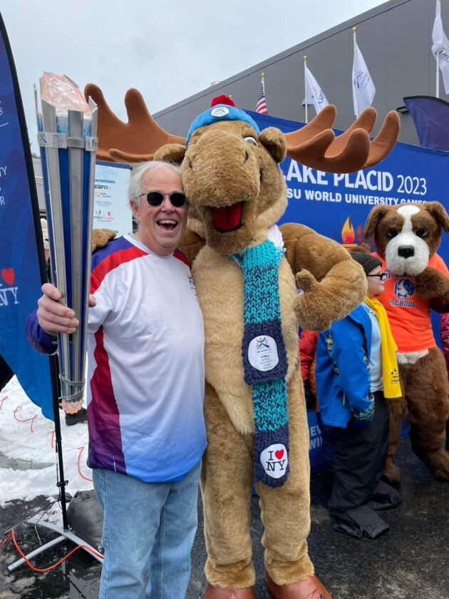 Long standing Saranac Lake Civic Center board member and leader Mike Ritchie celebrates at the opening ceremony for the World University Games in 2023. The civic Center was the exclusive host for the curling events at the games. (Photo provided)