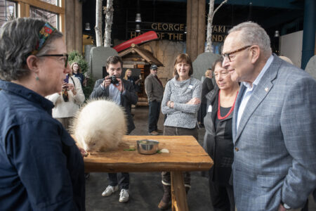 Wild Center Curator Leah Valerio showed off Bianca, the museum’s albino porcupine, during Schumer’s visit.