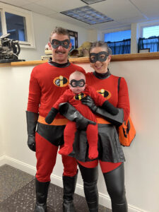 Chrystal Plowe-Sovey, Beckett and Blake Neigel trick-or-treat in the Enterprise office in Saranac Lake.