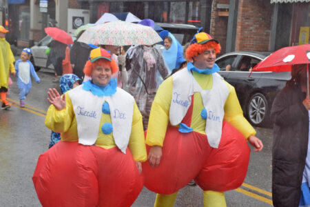 - Lisa Rissberger as Tweedle Dee, left, and Steve Shambo as Tweedle Dumb march in the Lake Placid Halloween Parade. (Enterprise photo — Chris Gaige)