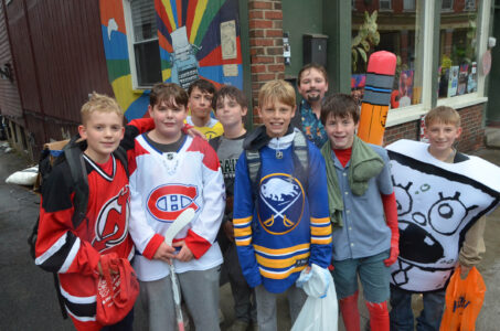 - A group of Saranac Lakers dressed as hockey players and characters from “SpongeBob SquarePants” and “The Boys” trick-or-treat on Broadway in Saranac Lake. (Enterprise photo — Aaron Marbone)