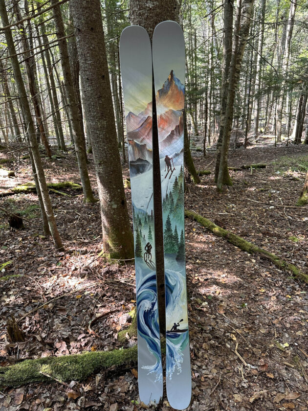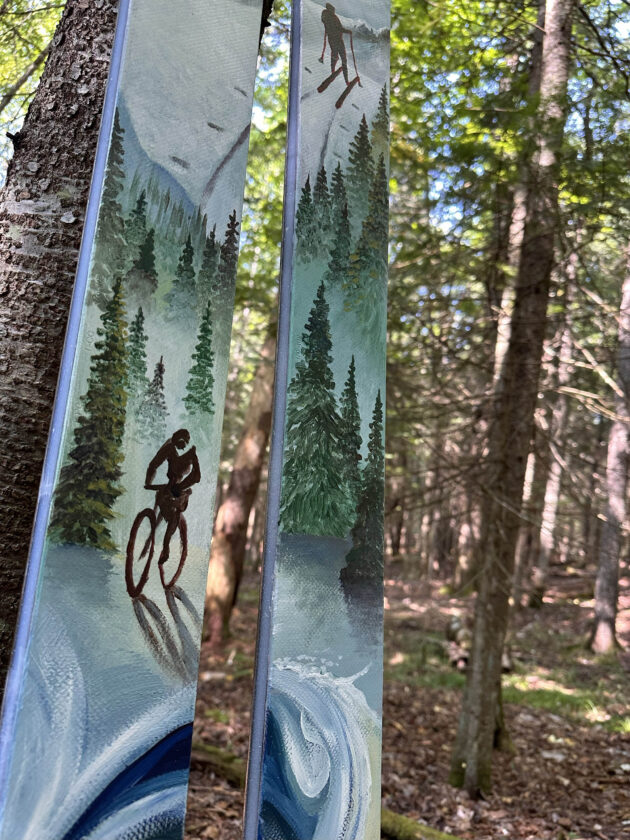 A pair of skis Sarah Calzada-Cain hand-painted for the Saranac Lake 3P, which will be raffled off at the race on March 7. Raffle tickets and registration for the race both open on Monday. (Provided photo — Sarah Calzada-Cain)