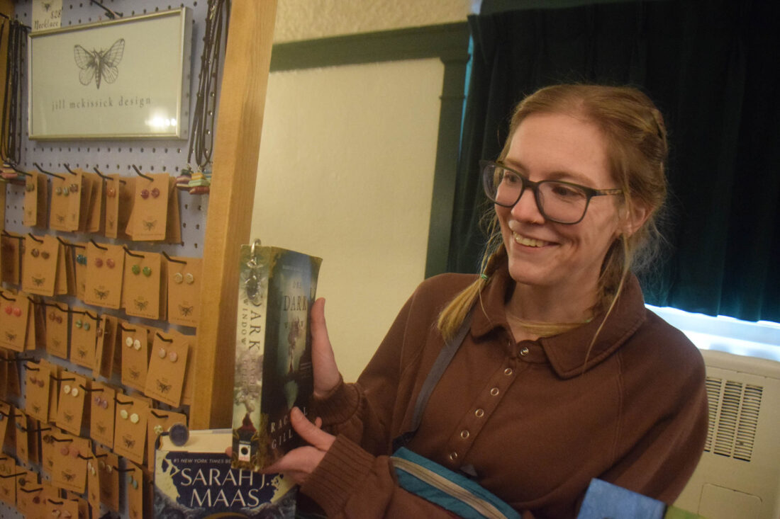 Jill McKissick of Wilmington shows off a bookmark charm she was selling at the Sparkle Village Craft Show and Sale in Saranac Lake in December 2023. (Enterprise photo — Aaron Marbone)