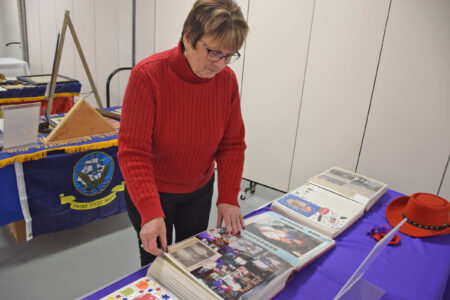 - Kathleen Lefebvre, president of the Tupper Lake History Museum, looks through a scrapbook on display at Tupper Arts. It’s part of a veterans’ tribute exhibit between the Tupper Lake History Museum and Tupper Arts. (Enterprise photo — Chris Gaige)