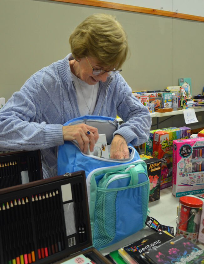 - Theresa Daunais adds a selfie light to a backpack full of gifts the Saranac Lake Holiday Helpers have collected for the holiday season in the gym of the Saranac Lake Baptist Church. (Enterprise photo — Aaron Marbone)