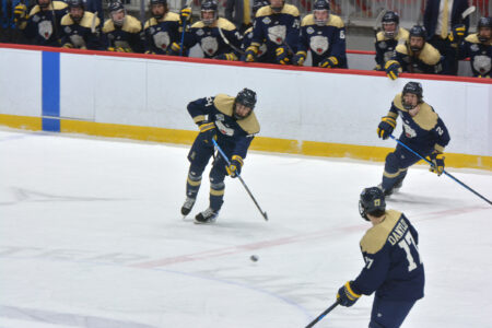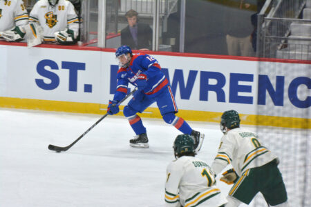 The River Hawks jumped out to a 2-0 lead in the opening period, before the Saints connected on three straight goals to close out the period. St. Lawrence’s Cayden Casey, Rasmus Svartstrom and Sam Frandina each found the back of the net once during that stretch.