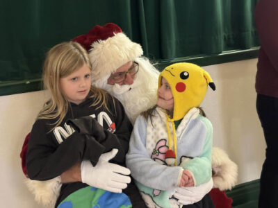 - Madilyn and Gwyneth Ploof tell Santa their Christmas wishes at the Holiday Helpers Christmas Concert Saturday at the Harrietstown Town Hall. (Photo provided)