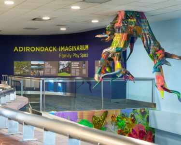 It celebrates the natural and cultural beauty of New York’s North Country and the Adirondacks. The space combines hands-on play, art and education in a welcoming setting for families. Highlights include a recreation of popular exhibits from The Wild Center, such as the Wild Walk Eagle’s Nest and an interactive game developed by Wild Center Curator Leah Valerio. It encourages children to experience a “year in the life” of a bald eagle. A large panoramic photograph shows the exact view of the Raquette River Oxbow as seen from The Wild Center’s Wild Walk, bringing Tupper Lake to travelers in the Capital region.