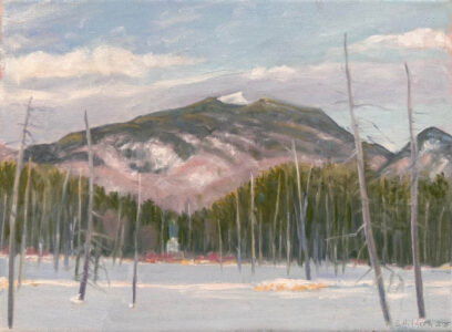 Spending much of the year outdoors doing plein air paintings, which often capture the passage of time over the course of the hours it takes to complete a painting, Hildreth completed most of the paintings in this exhibit in her studio. This allowed her more time to study and focus on the unique qualities of light in the Adirondack winter. The paintings also illustrate the many different colors of snow other than brilliant white (and not dirty brown).
